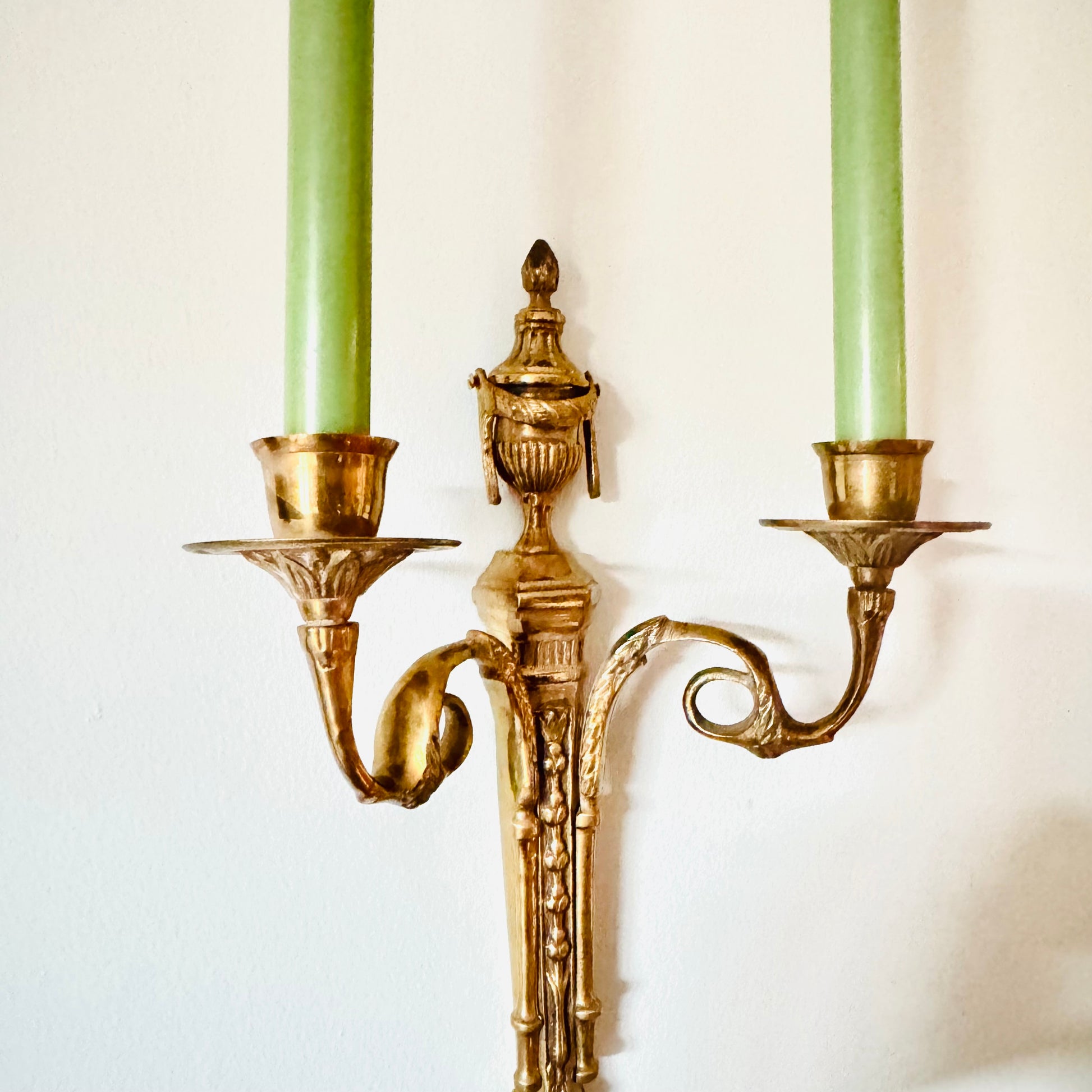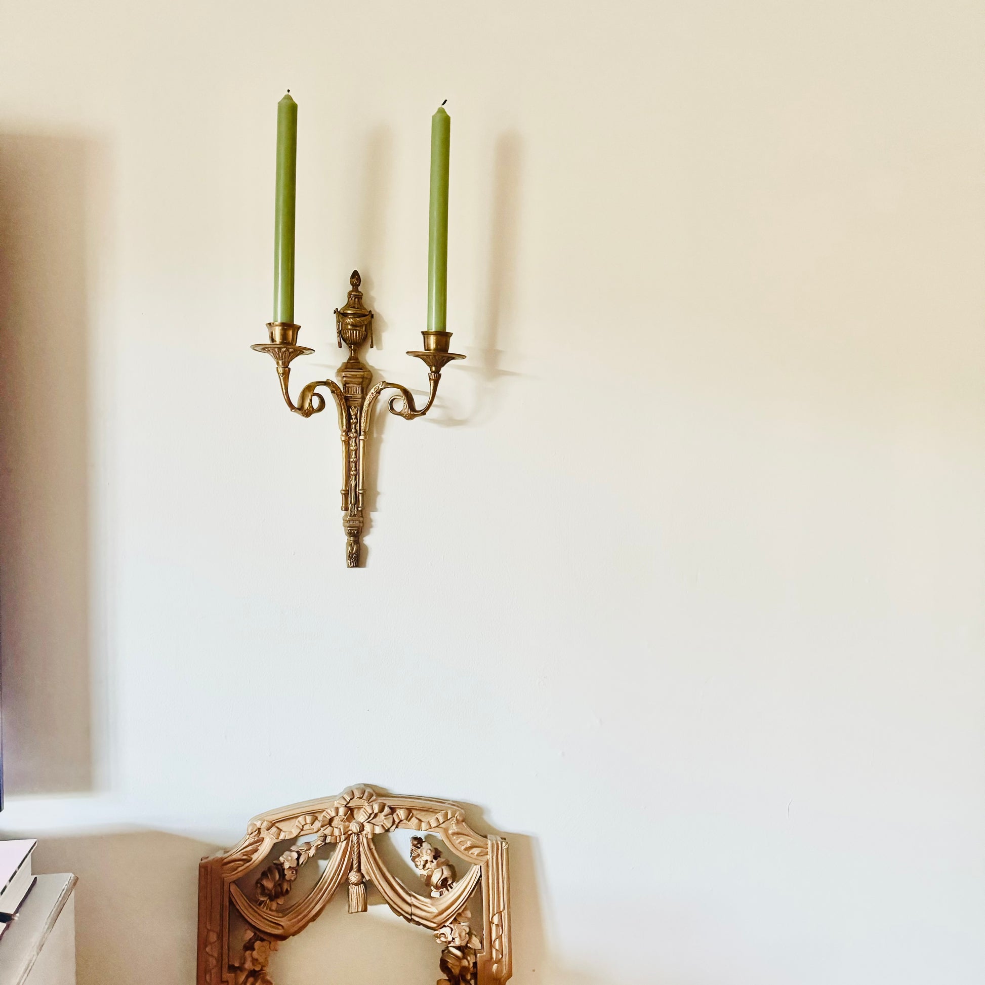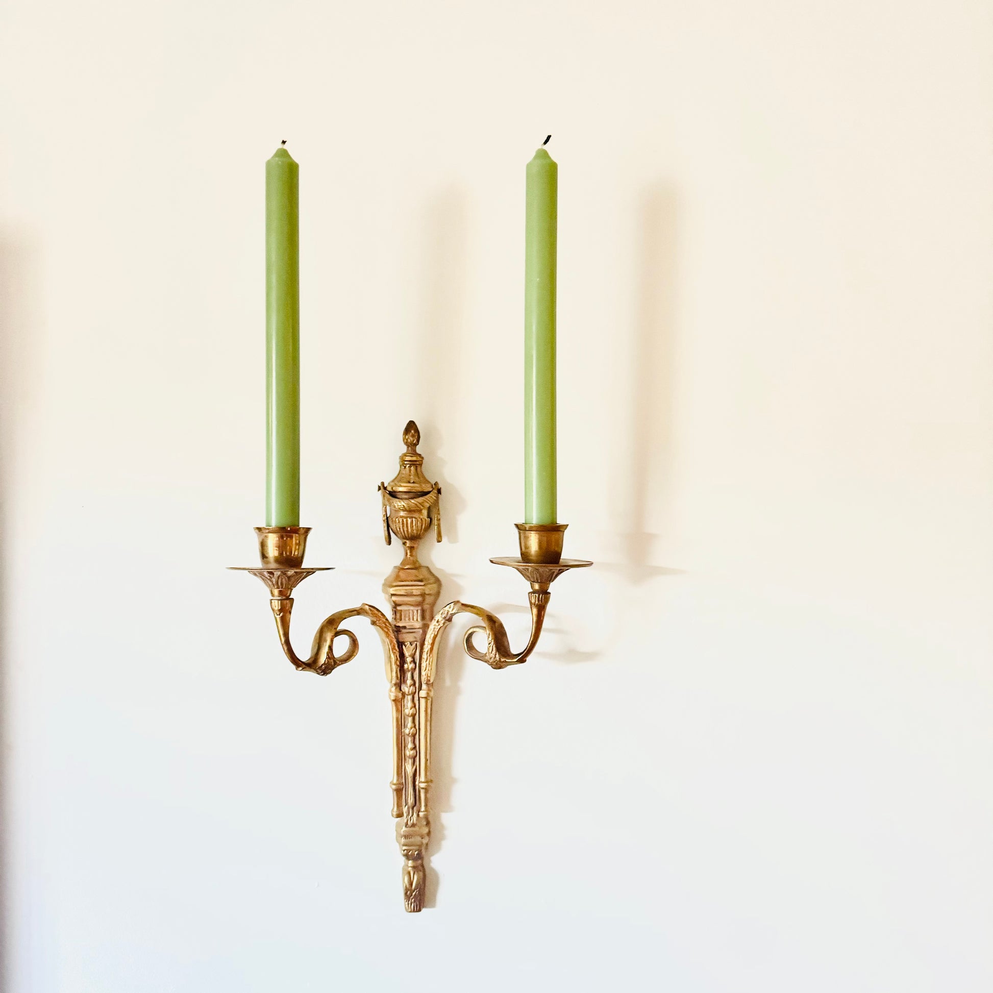 Brass neoclassical style wall sconce. It is gorgeous, heavy, and well-made, holds two candles and is ready to grace your walls. Heavily detailed with an urn-shaped top, it is the perfect accent for your gallery wall. I just love pairing sconces with art pieces for small groupings!