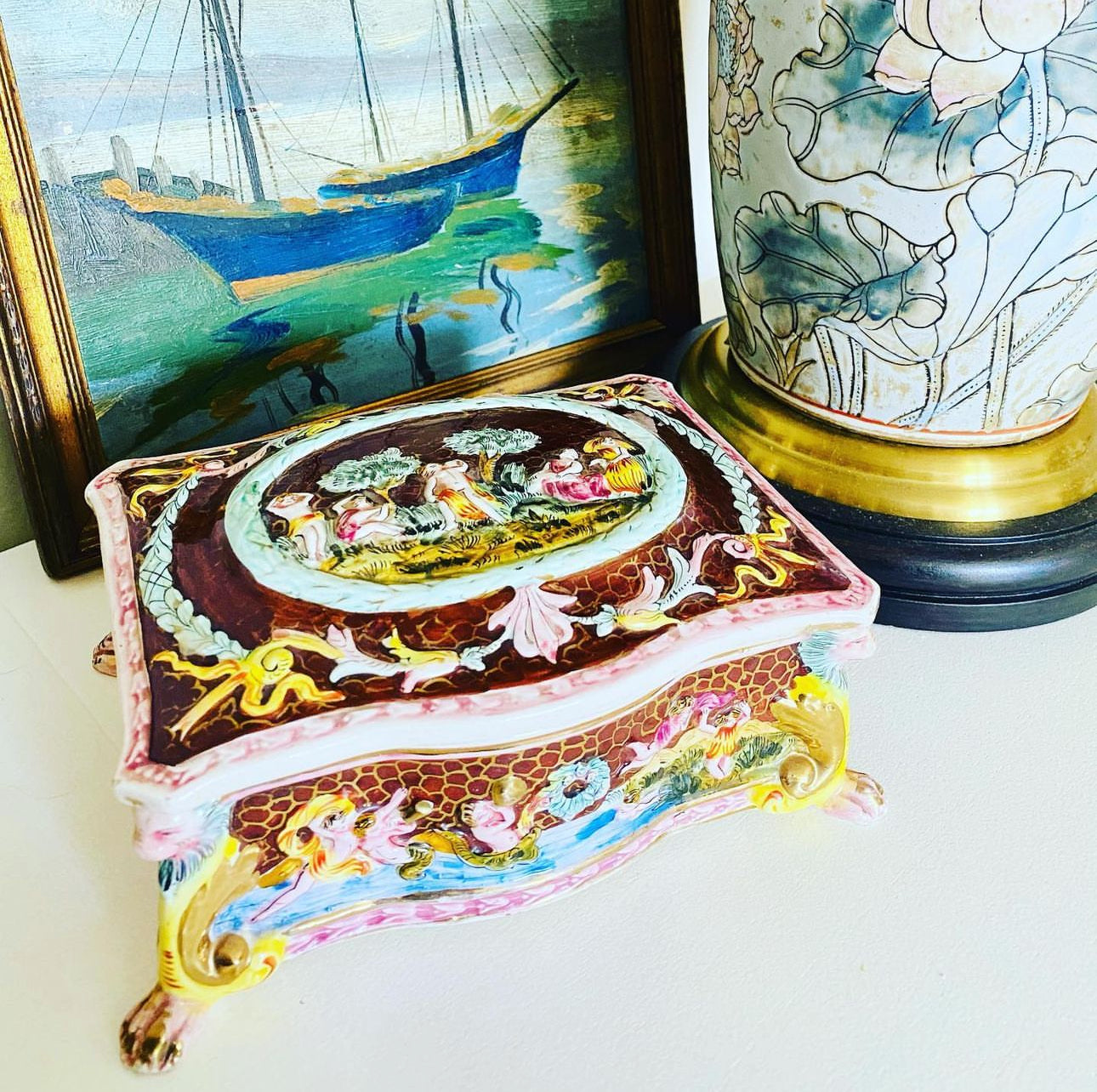 This lovely Capodimonte lidded box, with the raised cherubs is made in Italy and measures approximately 7" wide by 5.5" deep and 3" tall. It is the perfect piece to add a pop of color! It's in pristine condition, no chips or cracks!