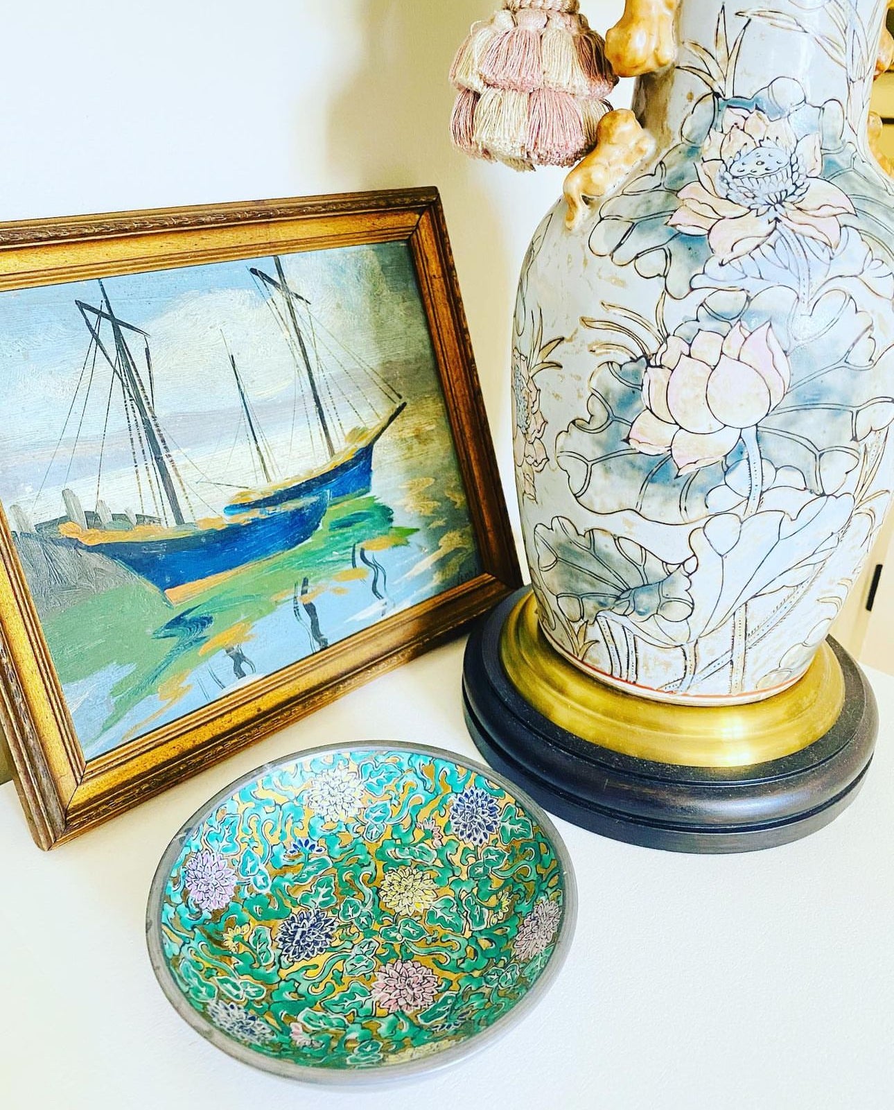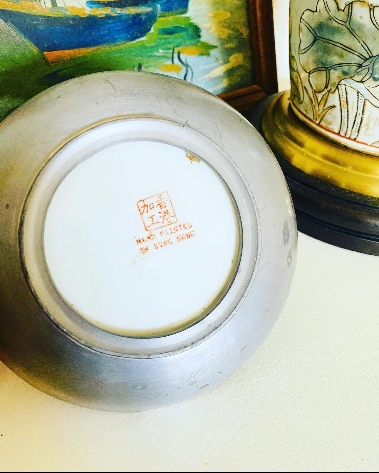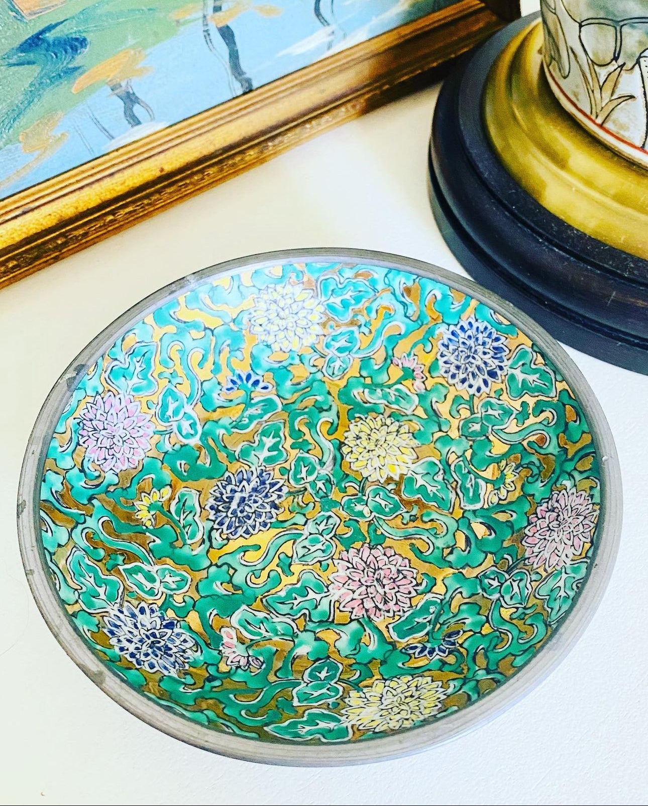 These pewter encased bowls are such a chinoiserie statement piece! They look lovely wherever they are placed...in vignettes, entryways, coffee tables...bookcases!! The colors of this one are so vibrant and the gold is so eye catching! It measures approximately 5.5 inches wide.