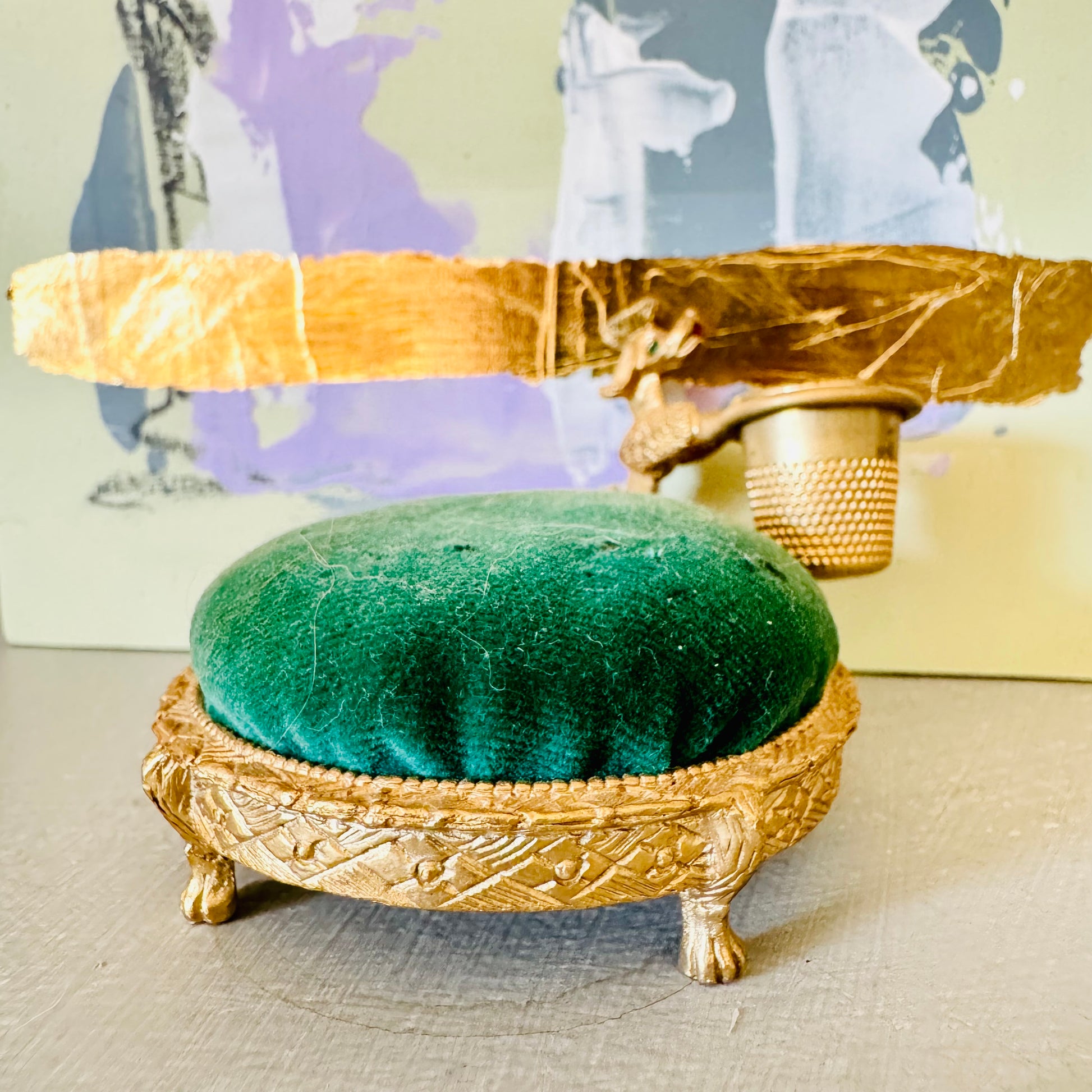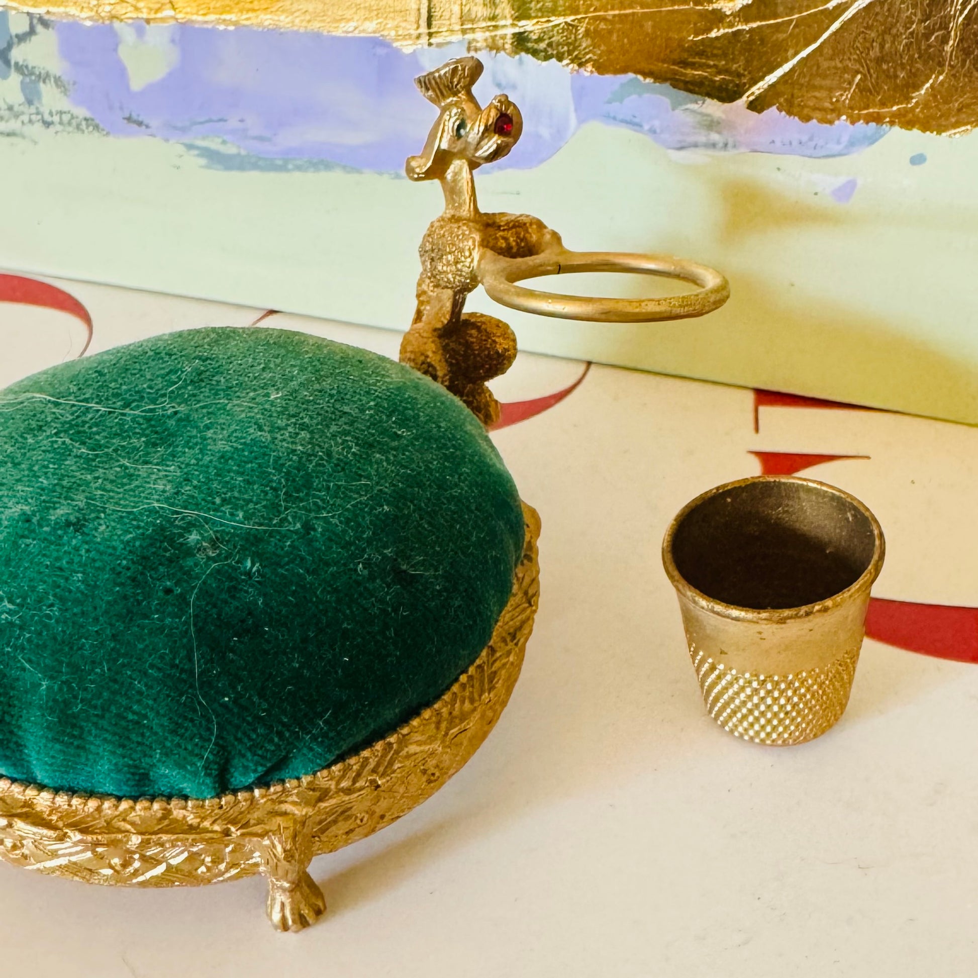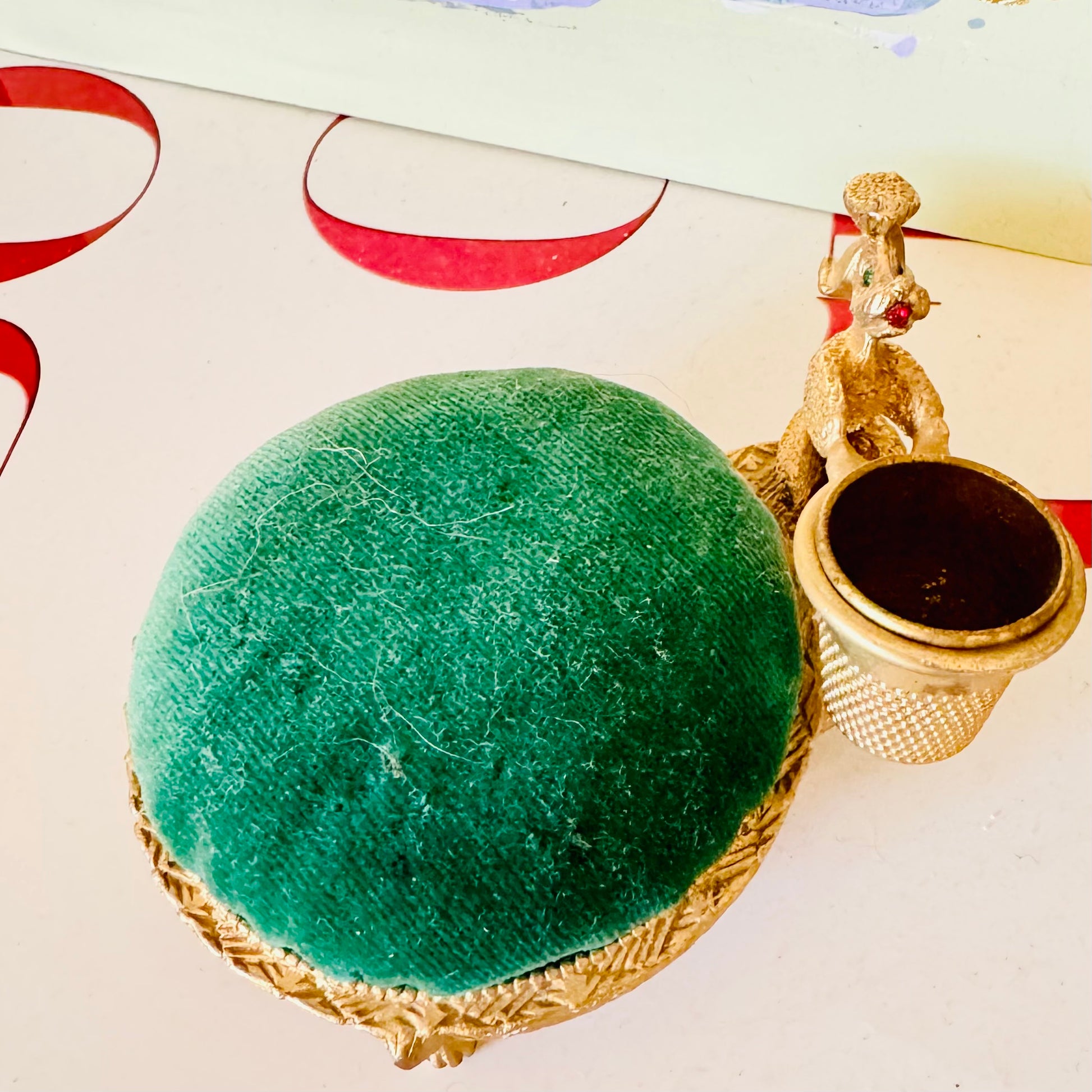 The cutest little vintage pin cushion and thimble holder with original thimble, believed to be from 40's maybe 50's. The pin cushion is covered with green velvet and the metal is gold tone. It features green rhinestone eyes and a red rhinestone for the mouth. The cushion itself measures 2" wide, the overall width of the item is 2.5", and the height is 2". In excellent vintage condition with all rhinestones still intact, no wear to the plating, and velvet is in great shape.