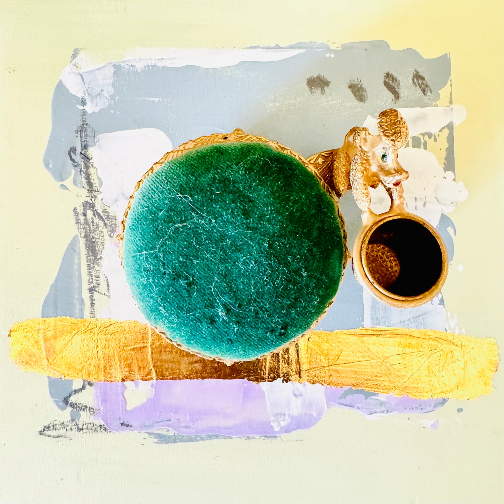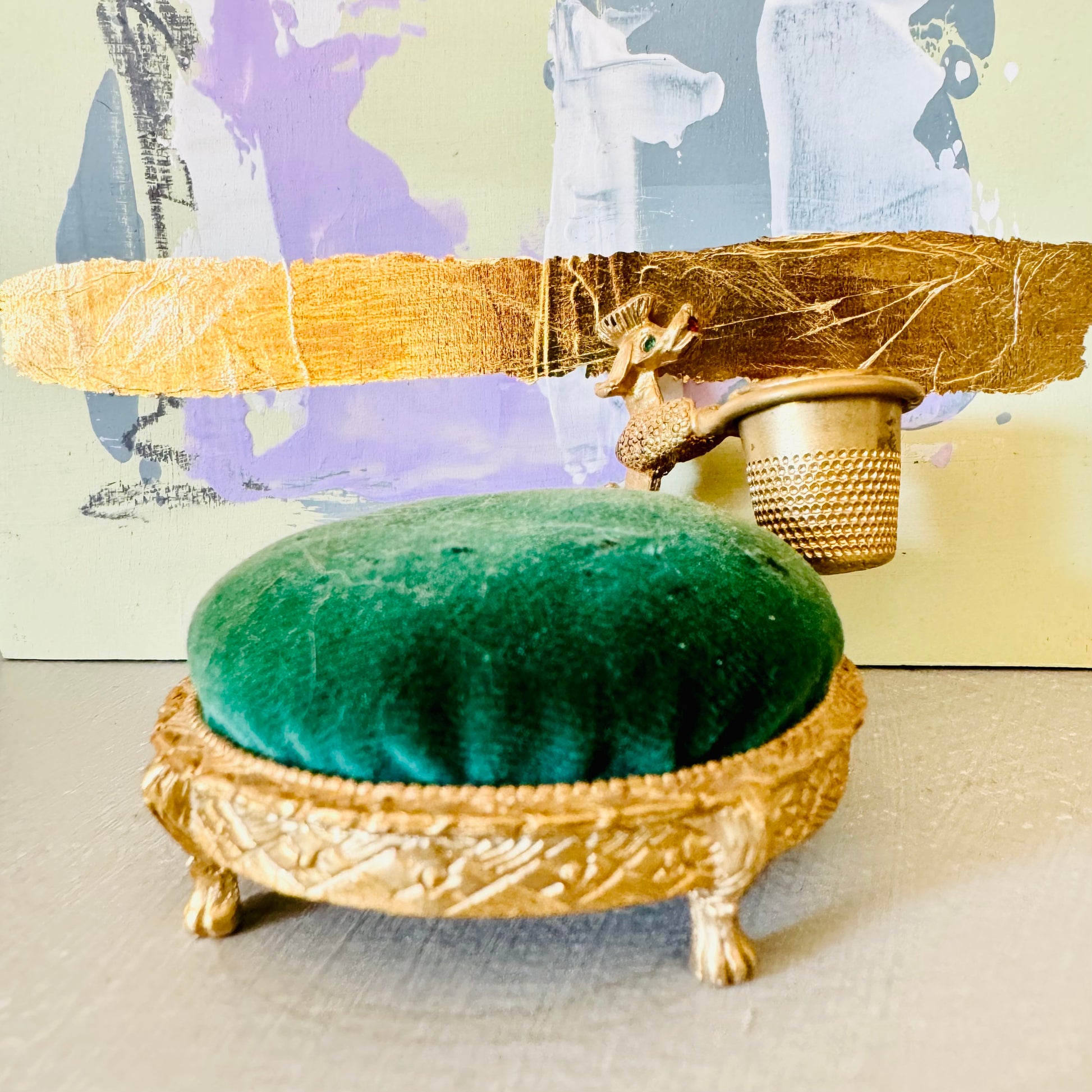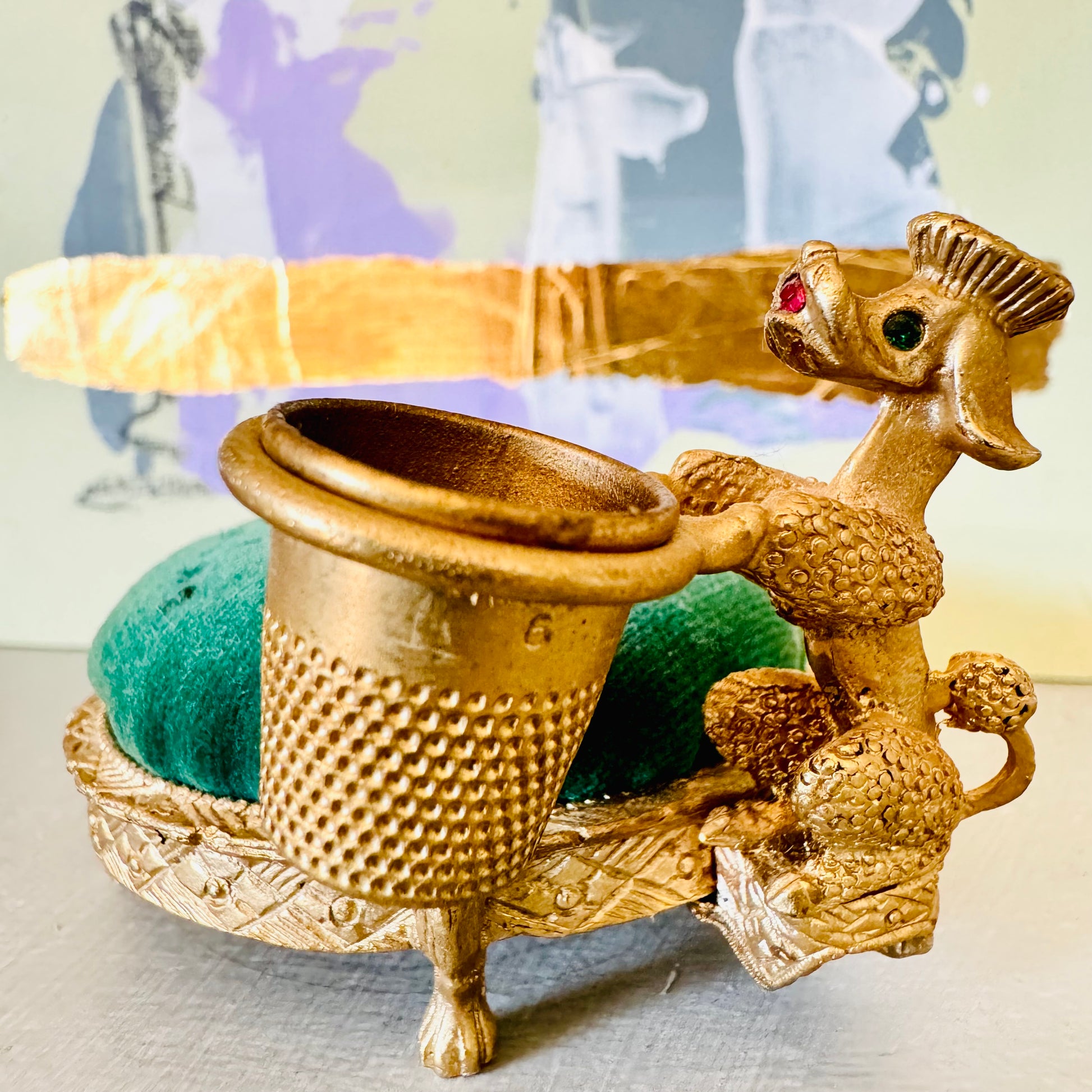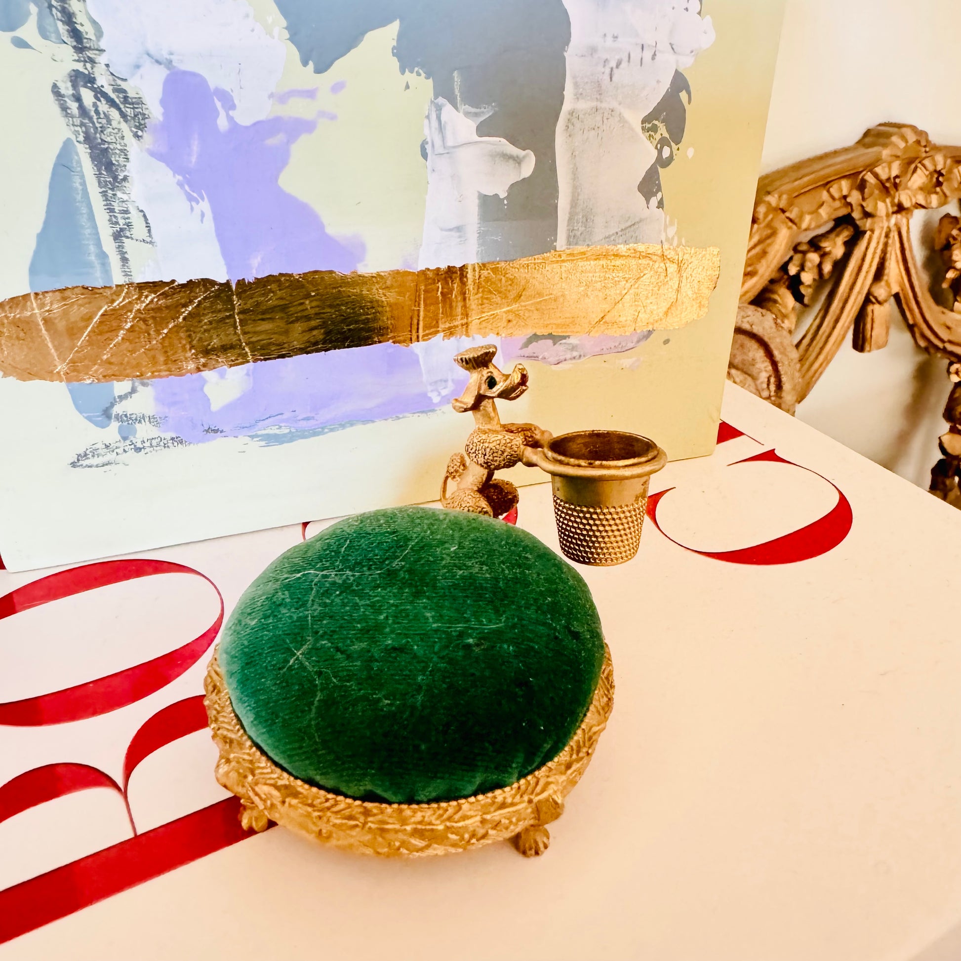 The cutest little vintage pin cushion and thimble holder with original thimble, believed to be from 40's maybe 50's. The pin cushion is covered with green velvet and the metal is gold tone. It features green rhinestone eyes and a red rhinestone for the mouth. The cushion itself measures 2" wide, the overall width of the item is 2.5", and the height is 2". In excellent vintage condition with all rhinestones still intact, no wear to the plating, and velvet is in great shape.
