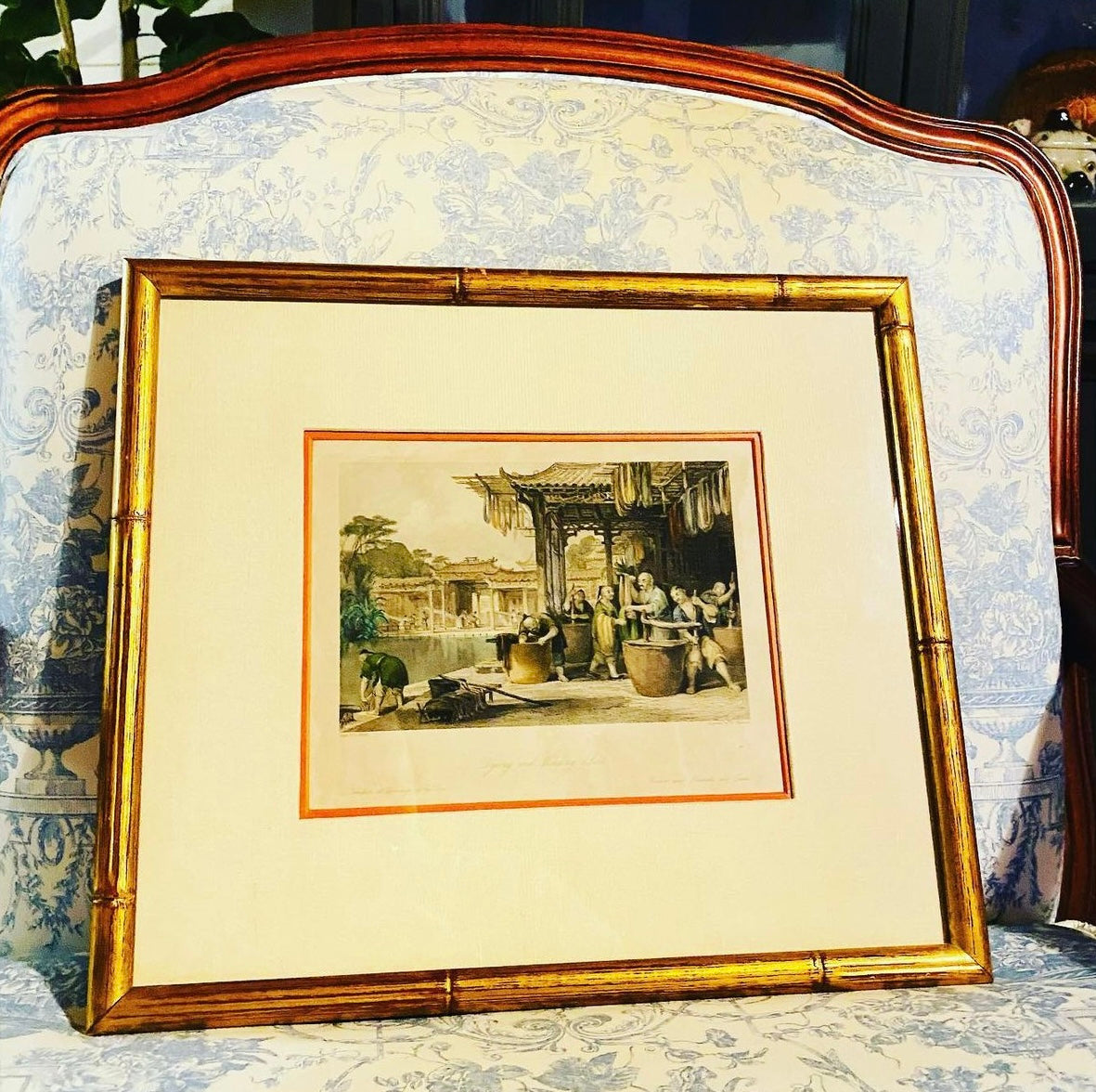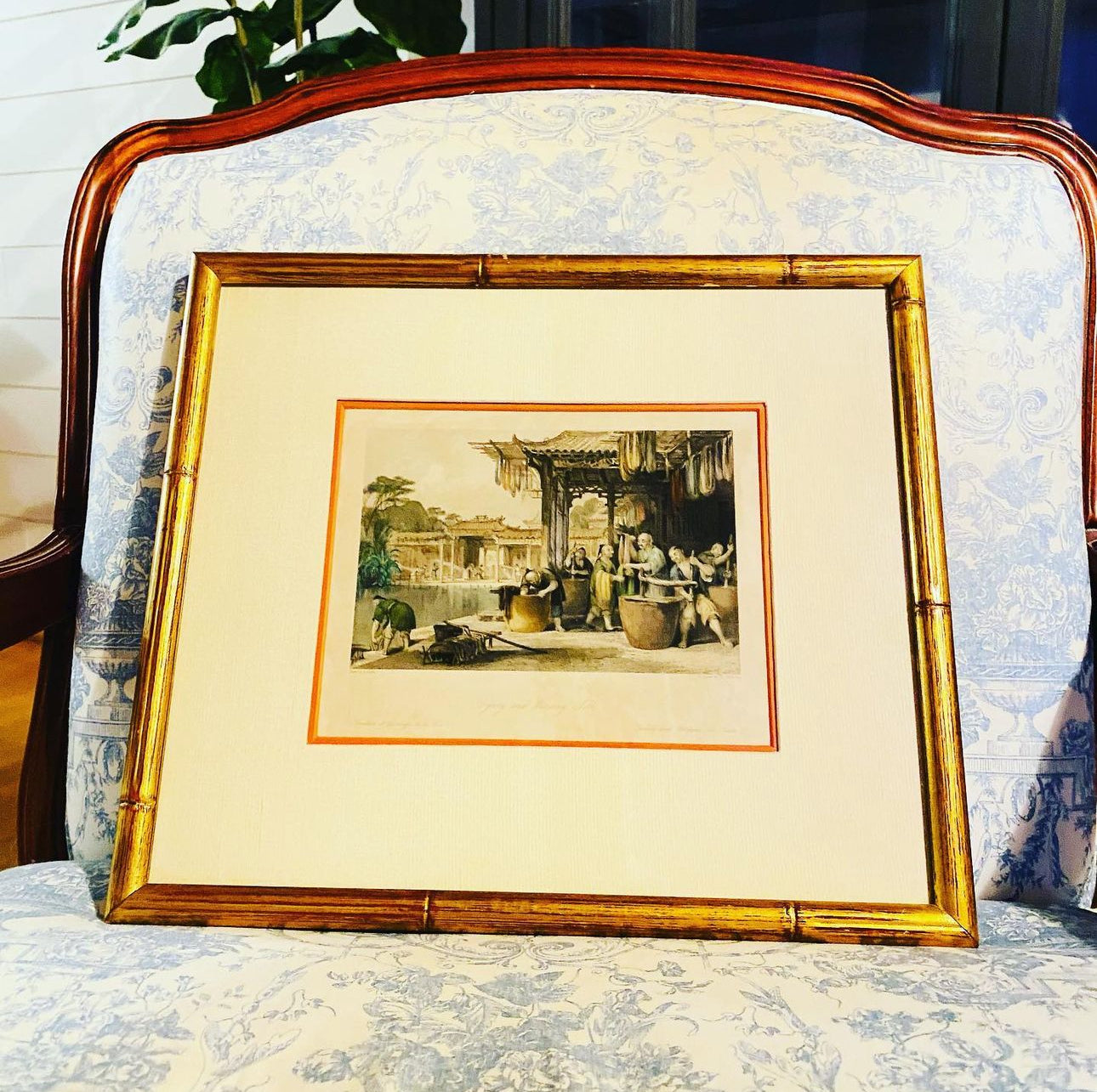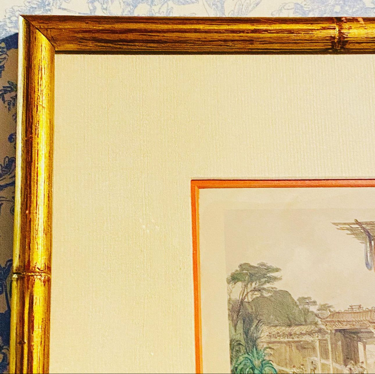 The wood bamboo frame is in excellent condition and the double matting is simply perfection! It's such a wonderful addition to any gallery wall!