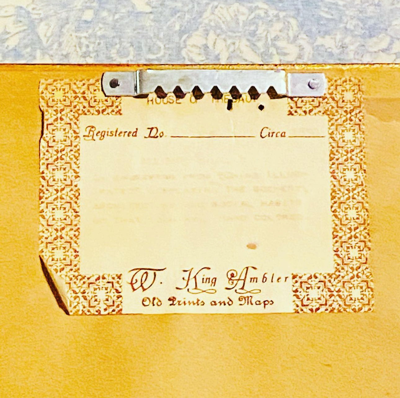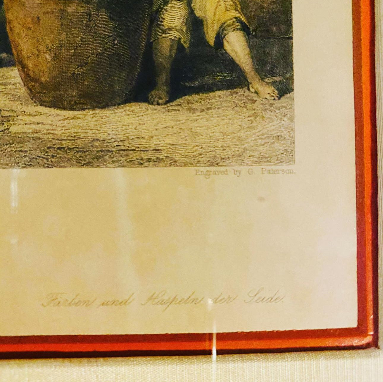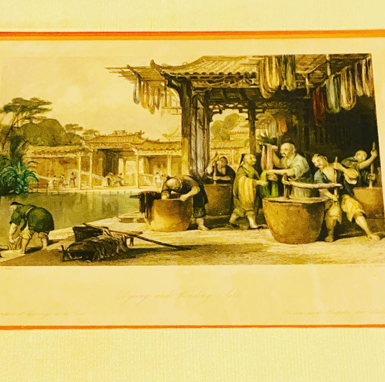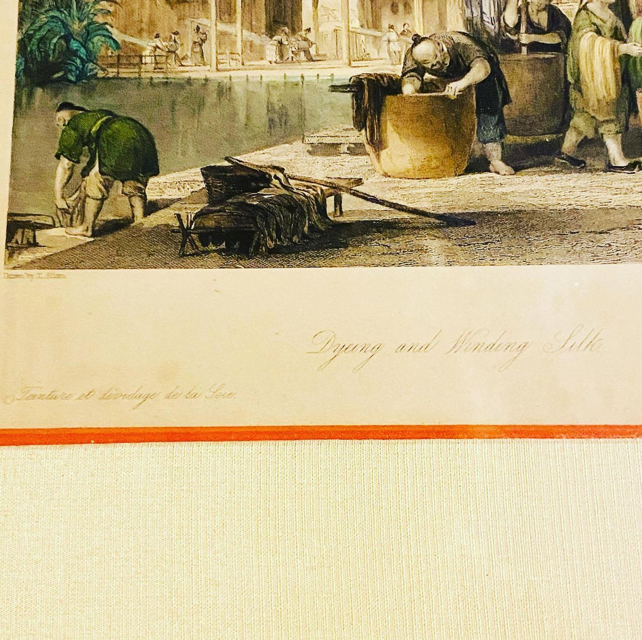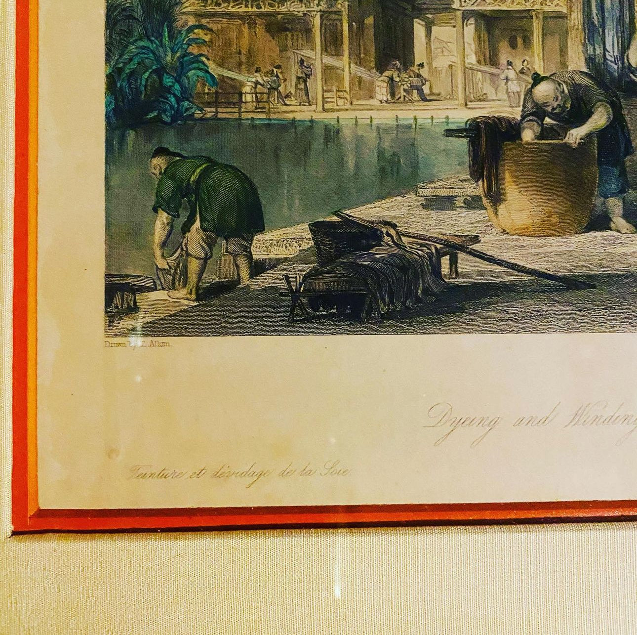 Old original framed engraving by Thomas Allom titled Dyeing and Winding Silk.