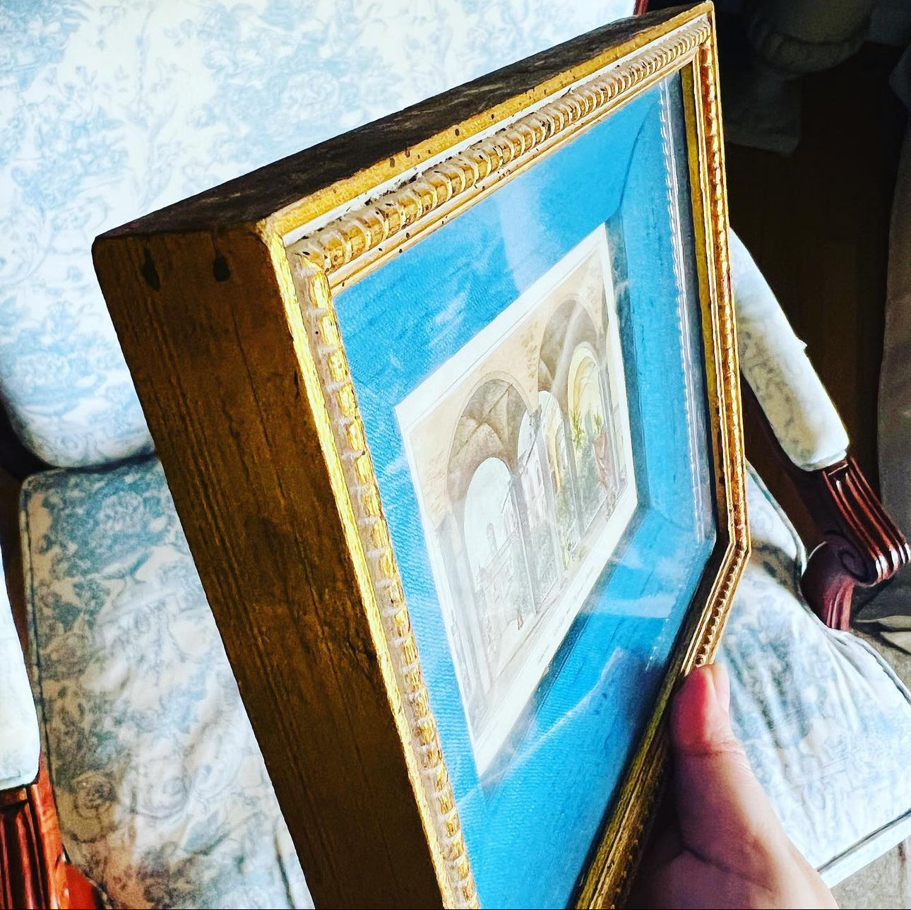 They measure 7.5 by 8.5 with the prettiest wood gold frame!