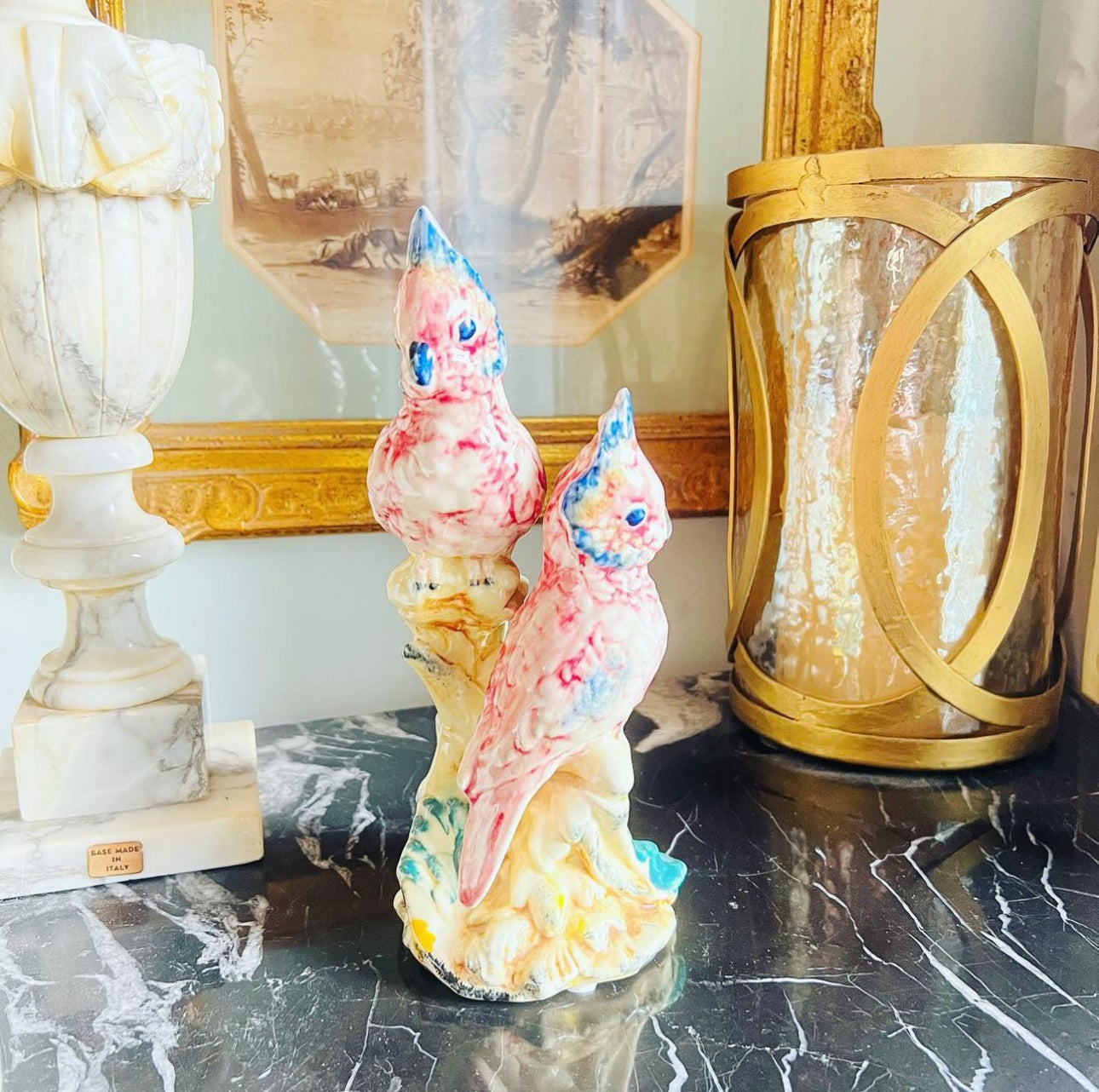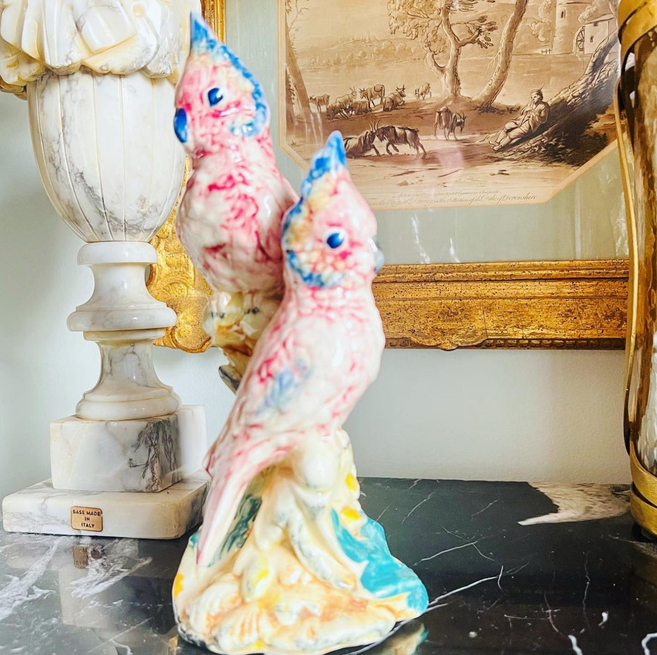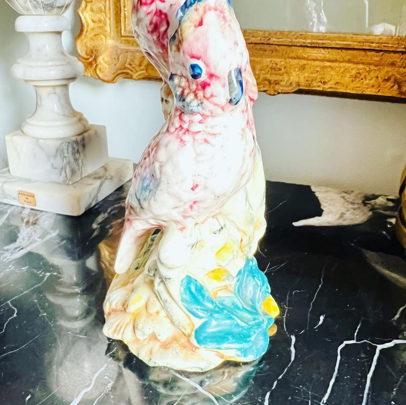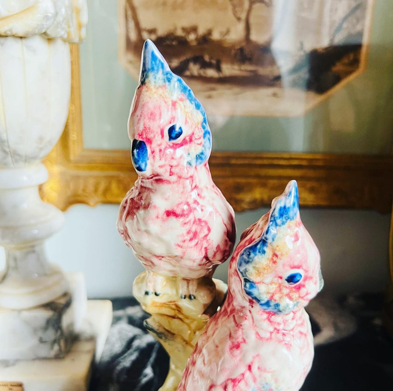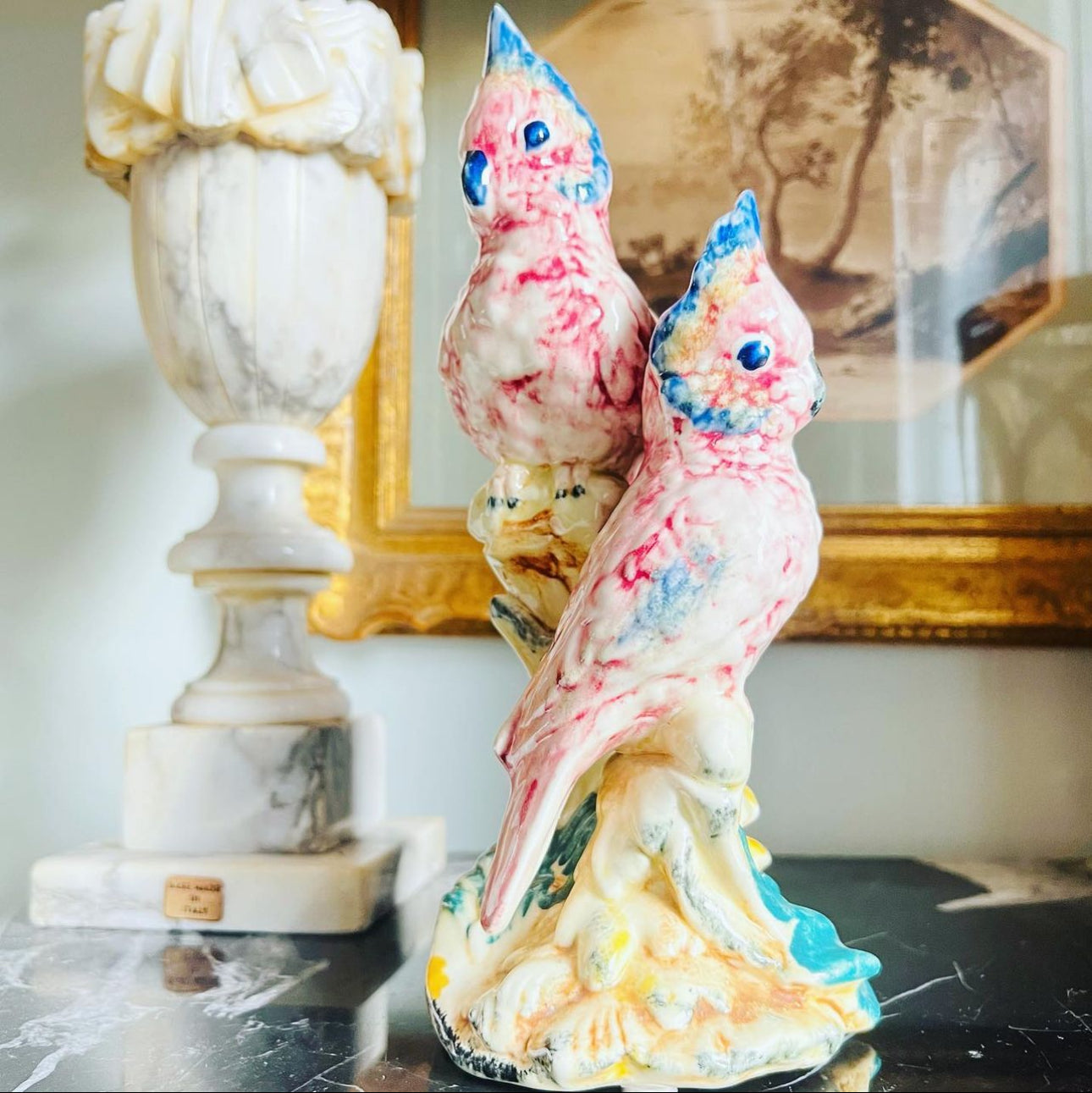 Stunning Stangl Pottery figurine, featuring two perfect pink cockatoos perched on a branch.