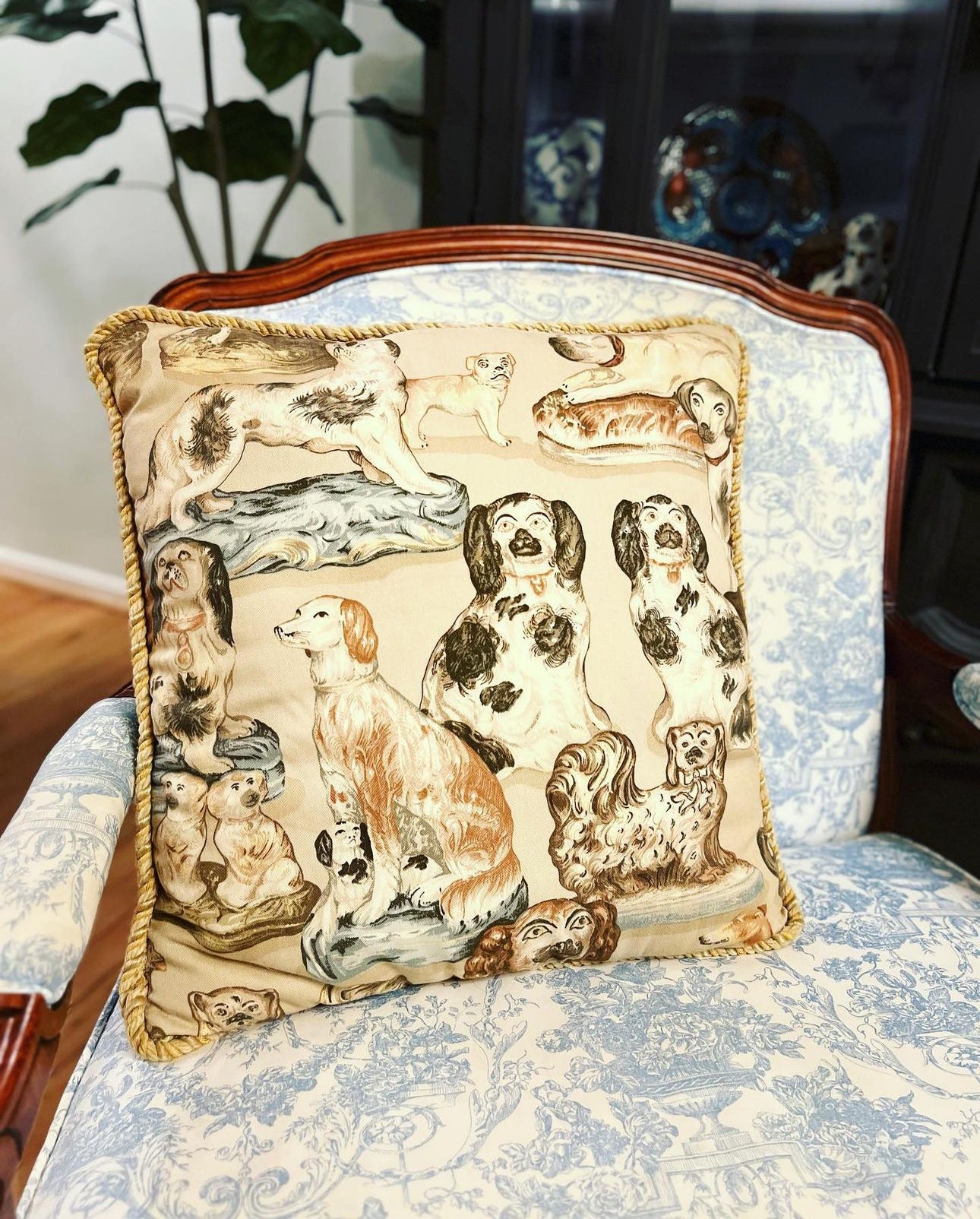 This piece is such a fun accent pillow featuring a Staffordshire Dog Printed Cotton Traditional Statue upholstery fabric, with coordinating pipping and a very nice backing.