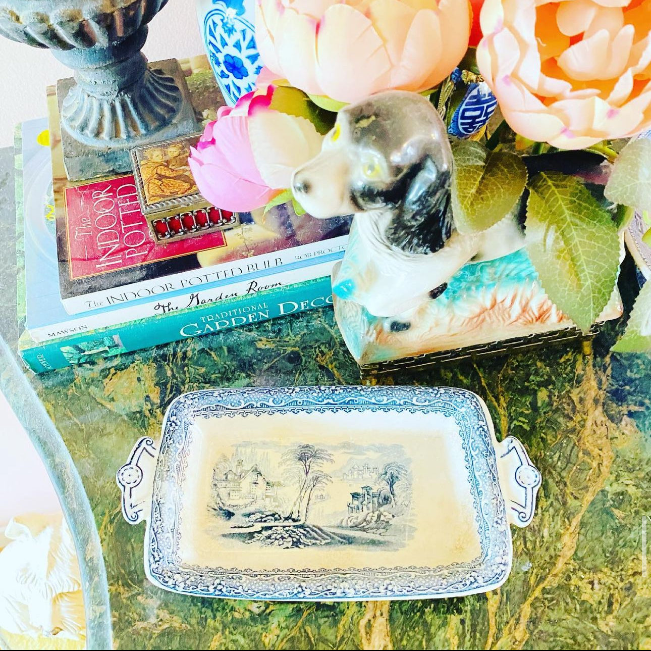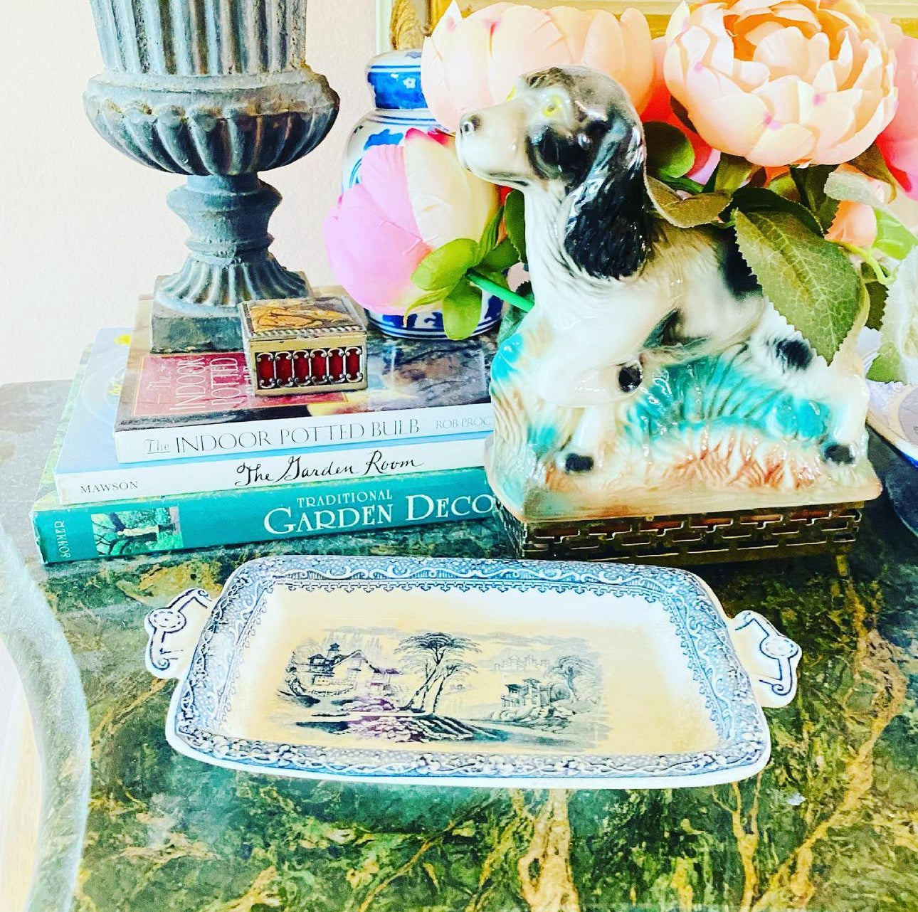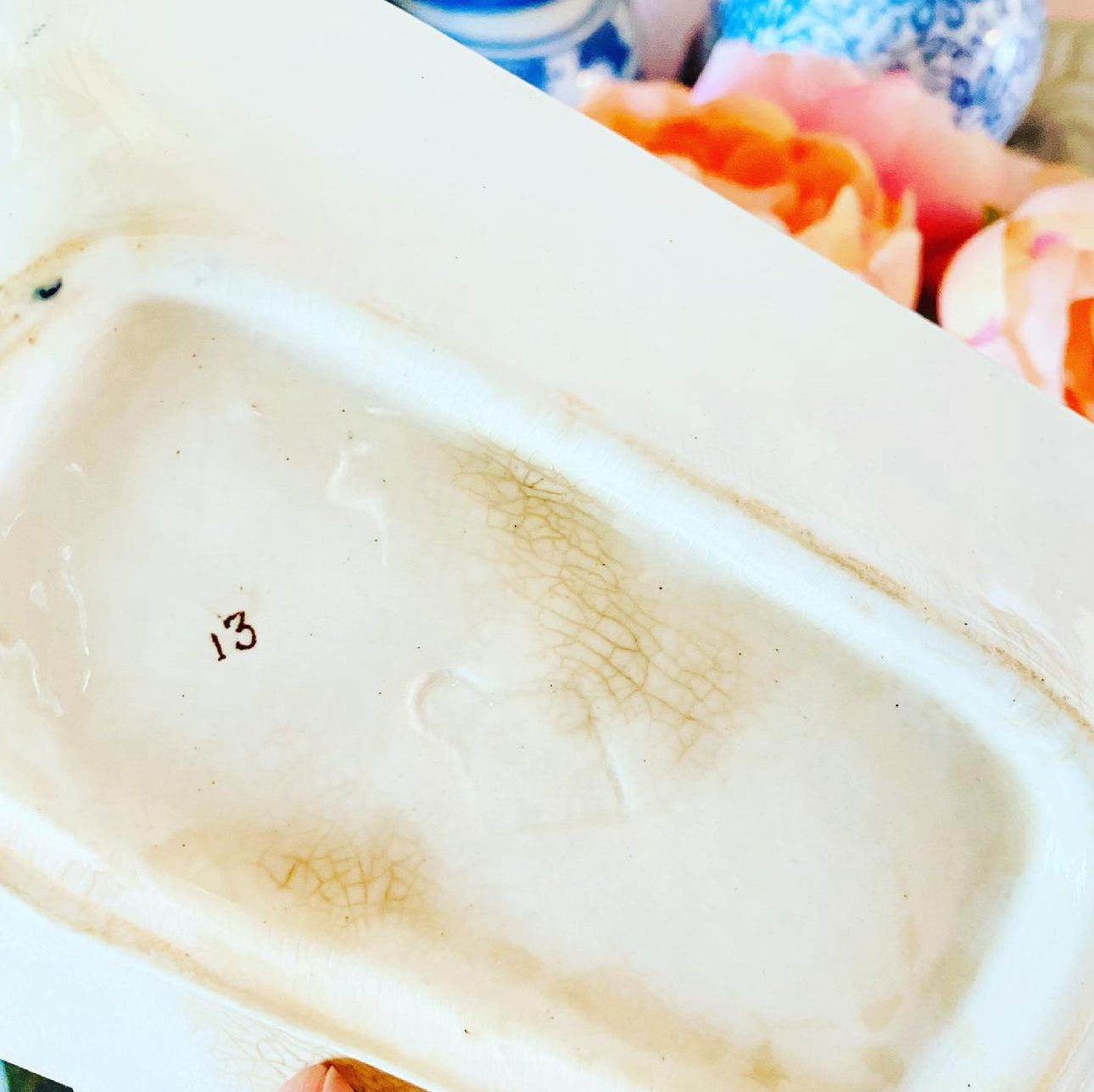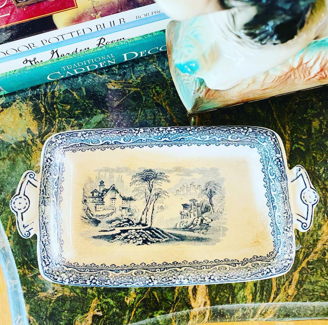 How precious is this blue and white ironstone dish, it measures 4 3/4 by 8.5 inches, and is in excellent condition, no chips or cracks. It would be so perfect for a side table or an entryway!